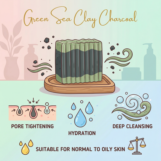 Green Sea Clay Charcoal Bar Soap Pack of 3 | Deep Cleansing Handmade Bar with Activated Charcoal | Pore Tightening Hydrating Cleanser for Normal to Oily Skin