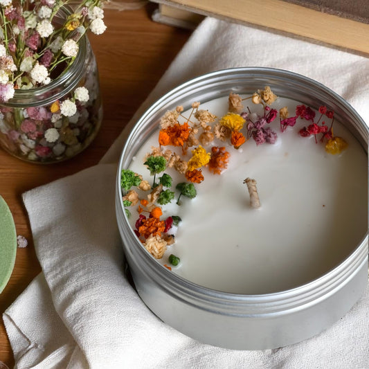 Scented Floral Candle in Tin – Natural Soy Wax with Dried Botanicals (Vanilla Jasmine)