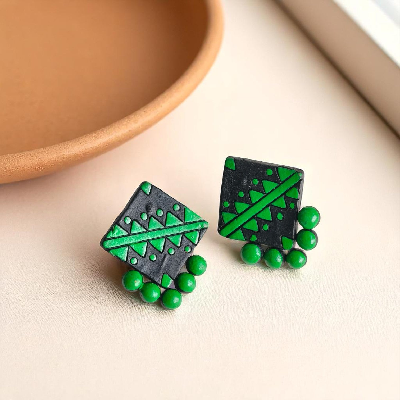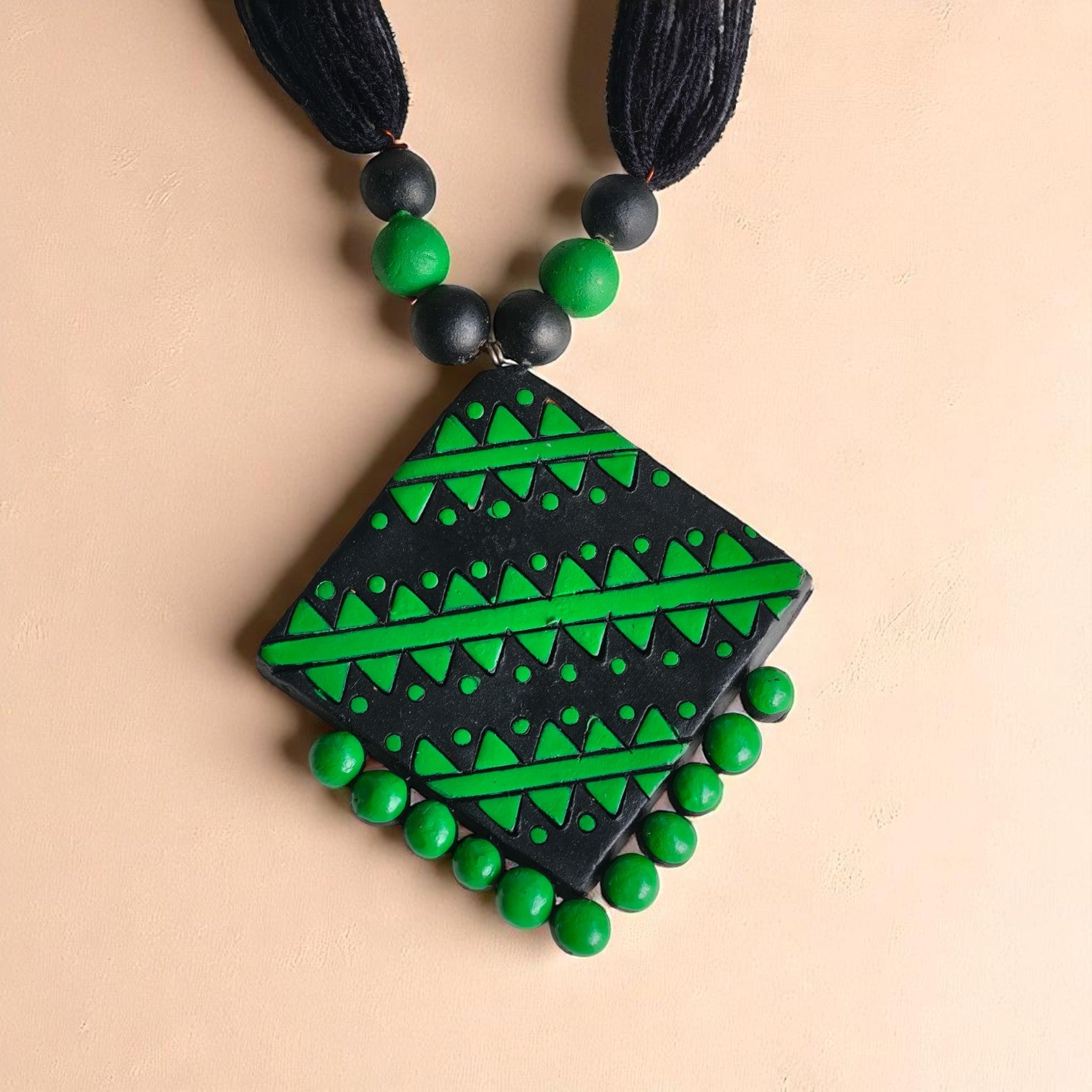 Bold, geometric, and rooted in tradition—this handcrafted terracotta necklace and earring set is a celebration of tribal artistry and earthy elegance. Featuring a diamond-shaped pendant adorned with hand-painted patterns in vibrant green and deep black, the set is complemented by matching earrings and a multi-strand black thread necklace.