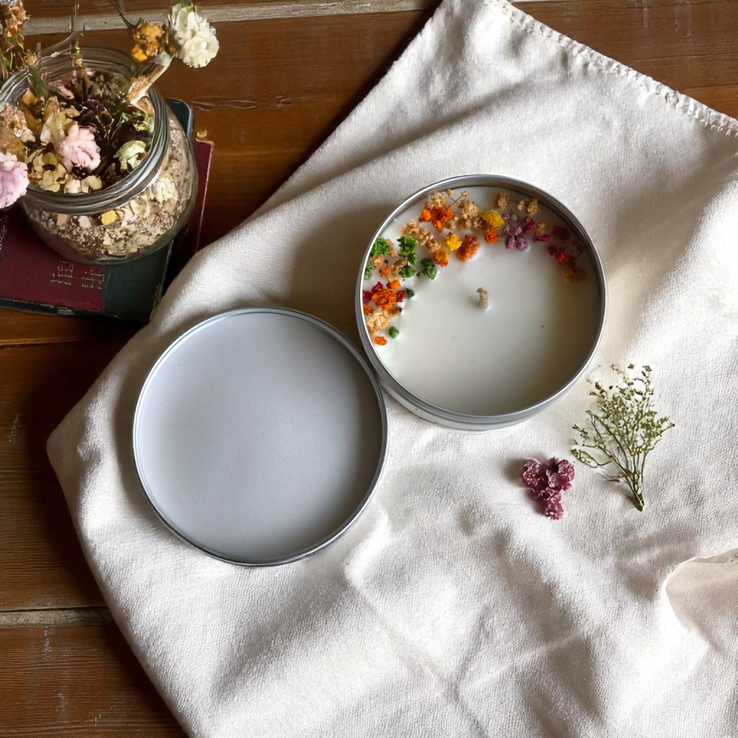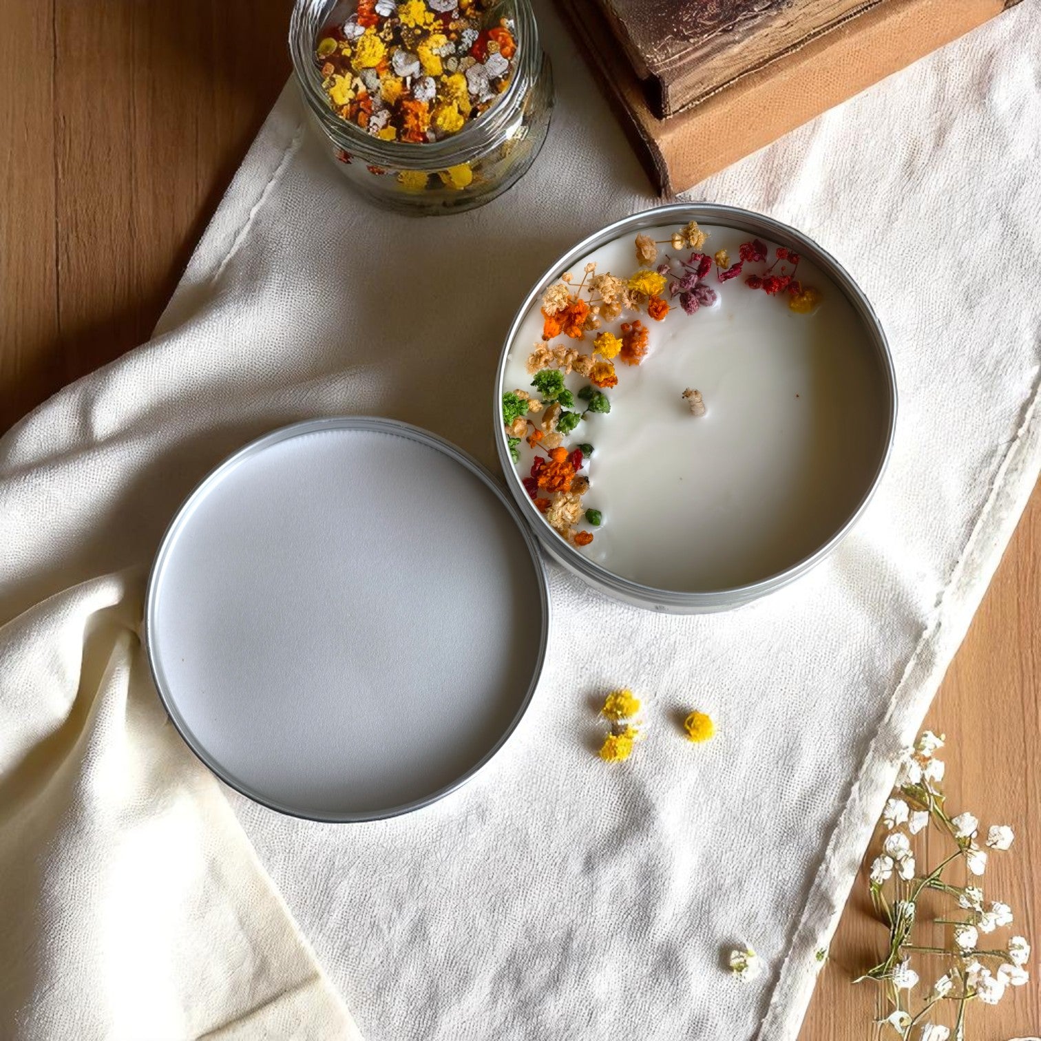 Hand-poured with clean-burning soy wax and delicately adorned with dried botanicals, this 100g tin candle is a celebration of craftsmanship and calm. The soft floral aroma gently fills your space, making it perfect for cozy evenings, meditation, gifting, or simply enhancing your home décor. Packaged in a sleek, reusable tin, it's ideal for travel or small corners of your home.