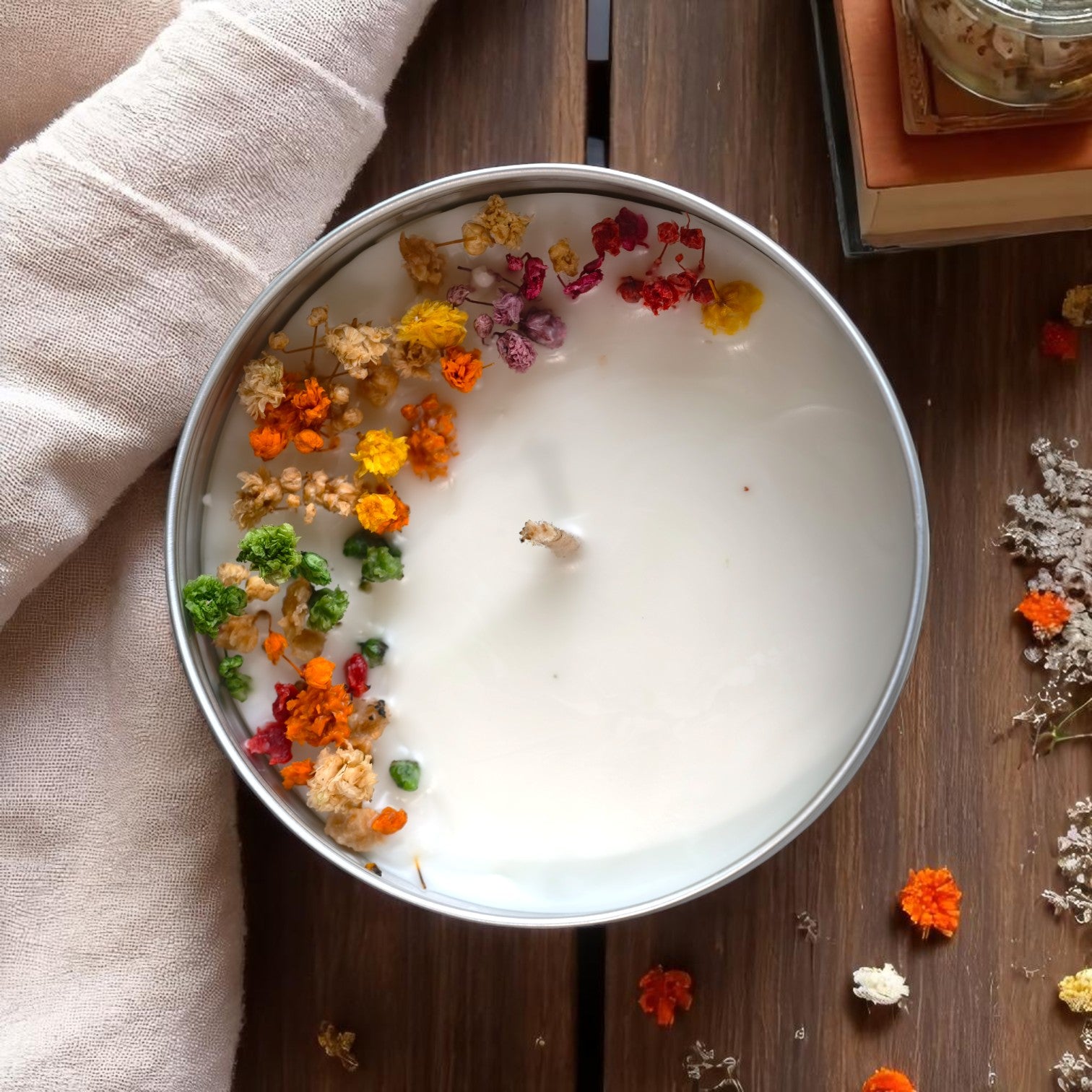 Scented Floral Candle in Tin – Natural Soy Wax with Dried Botanicals (Vanilla Jasmine)