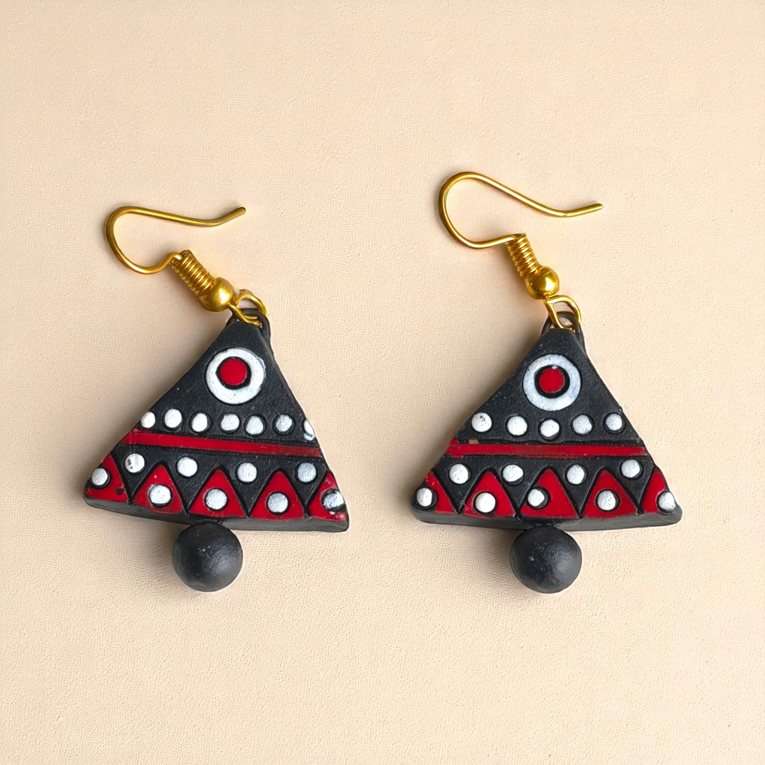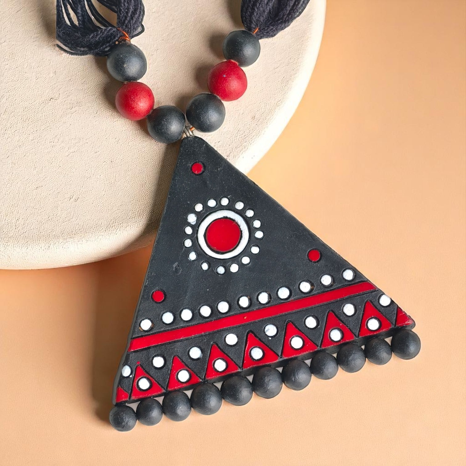 Bold geometry meets earthy tradition in this handcrafted terracotta necklace and earring set. Featuring a striking triangular pendant hand-painted in deep black, vibrant red, and crisp white, the design evokes tribal artistry and cultural symbolism. The coordinated earrings mirror the pendant’s bold form, completing a statement-making ensemble.